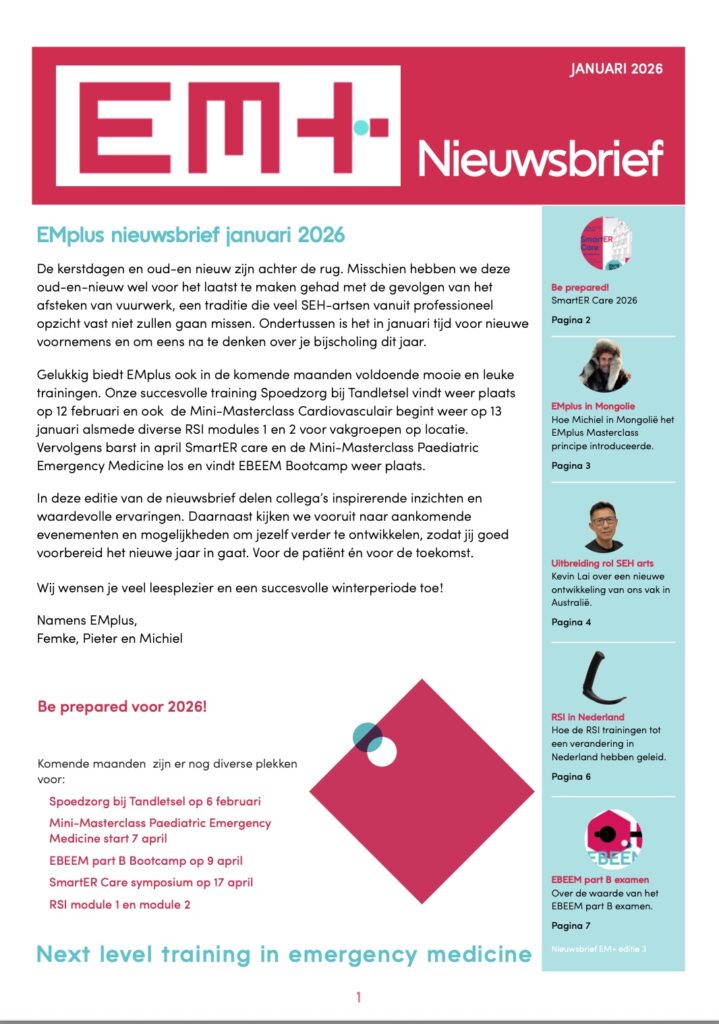 Our January newsletter in Dutch with news about new developments in Emergency Medicine, EMplus in Mongolia, the EBEEM part B exam, the success of the RSI course and much more.